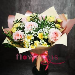 Очаровательно нежные белые розы – идеальное композиционное решение для букета, в сочетании нежно розовых кустовых роз, который прекрасно подойдет как классический подарок, так и в тематическое торжество. А так же можно сказать что ,  младшие сёстры королевы цветов в паре покорят сердце любой девушки